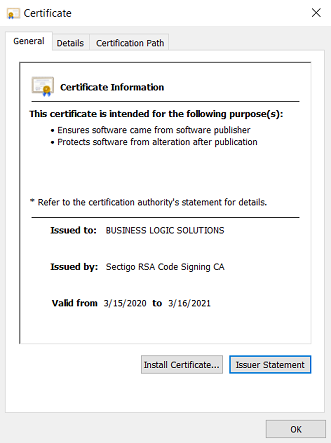 The Give'em a Break installer file (GivemaBreakSetup.exe) has been code signed and officially granted a Digital Certificate by Sectigo Limited. Sectigo Limited is an officially recognized Certificate of Authority (CA). The Digital Certificate is proof that the Give'em a Break installer file is a valid, safe and trusted software file as shown below. *If you have any questions or concerns about the validity of the Give'em a Break program or installer file, please contact us at support@breakscheduler.com.
