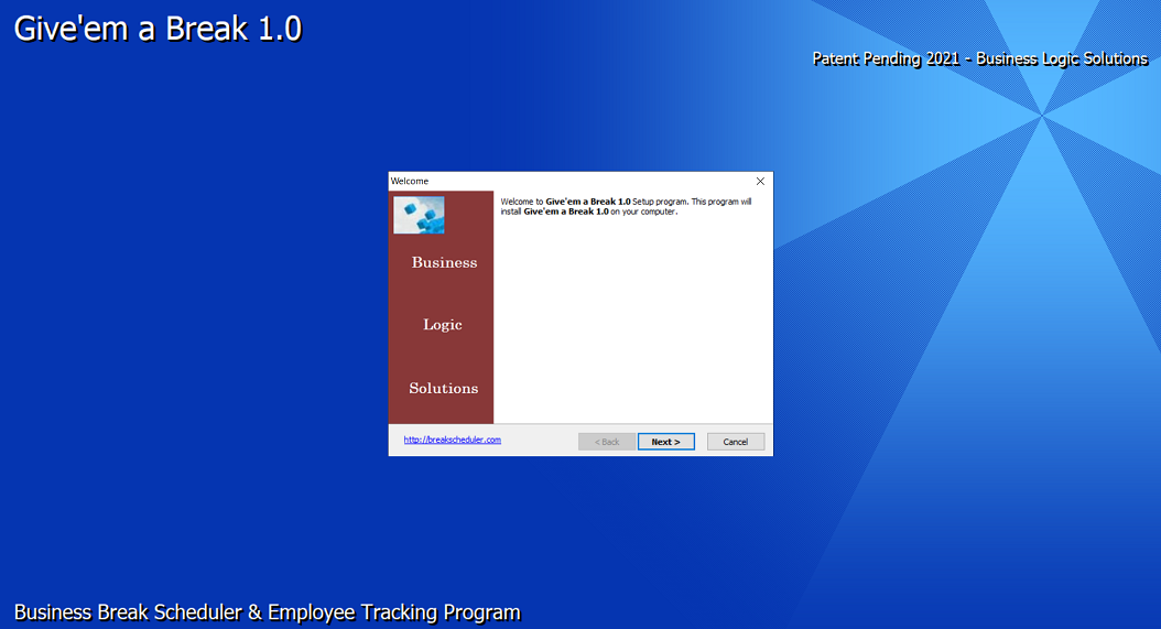 The Give'em a Break setup window will appear where you can proceed through the installation. Once the installation is completed, you can automatically start Give'em a Break or you can navigate to the Windows start menu/Business Logic Solutions folder and execute the Give'em a Break shortcut.