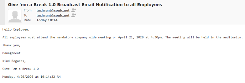 Automatic Tracking Mode = Give'em a Break will automatically send an email notification to the Relief Employee before the Employee automatically starts their First, Lunch or Last Break. *You can pre-notify the Relief Employee to provide the relief break 5, 10 or 15 minutes prior to the start of the Employee's break. Manual Tracking Mode = At any time prior to the start of the Employee's break, you can manually send an email to the Relief Employee to provide a relief break to the Employee by clicking the blue colored button labeled E (Email). Once you activate this Manual Tracking Mode feature, the E button will appear on the main dashboard interface within the Relief Employee section. To schedule a relief break for Employee A and manually send an email to that employee's Relief Employee (Employee B), complete these exampled steps: 1. On the main dashboard interface, click on Employee A in the Employees list to highlight that employee. 2. Within the First Break column, set the First Break start time for Employee A. 3. Within the First Break column, Click the combo box drop down arrow in the Relief Employee section and select Employee B. 4. Prior to the start time of Employee A's First Break, highlight Employee A and then click the button labeled E. Give'em a Break will send the relief break email to Employee B prompting Employee B to provide a relief break to Employee A. Pound # Keyboard Character = Give'em a Break provides the option of not sending any type of email to one or more employees and management by adding the # sign in front of their email address. The Send Broadcast Email feature provides the option to send a broadcast email to all employees and management simultaneously. This feature can be used for a multitude of events. Example events include: An emergency situation (Fire, earthquake etc..), directing employees to work overtime, directing employees to attend a company wide meeting etc...Any information entered into the message textbox field will be emailed. The email will be sent to every employee email address that is listed in the Work Schedule worksheet. The email will be sent to every management email address that is listed in the Branding/Notes feature. Here is an example visual representation of an email that will be sent to all employees and management.