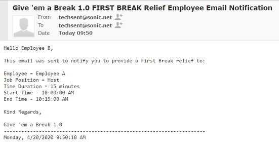 As you can see, the email sent to Employee A gives clear and concise break time direction and information. *Since this employee has been scheduled to fill the Cashier position after their Lunch Break completes, the email provides direction for them to do so. Automatic Tracking Mode = Give'em a Break will automatically send an email notification when any employee automatically starts their First, Lunch or Last Break. Manual Tracking Mode = An email notification will be automatically sent to the employee when you manually start the employee's First, Lunch or Last Break. -Send Emails to employees to start their relief breaks A relief break is a Relief Employee (Employee B) who is assigned to relieve a different employee (Employee A) and temporarily fill that employee's (Employee A) job position while Employee A is taking their scheduled break. Here is an example visual representation of an email that will be sent to Relief Employee B.