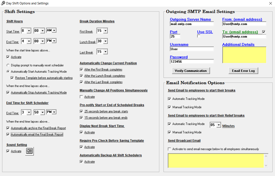 Automatically Backup All Shift Schedulers Automatically Change Current Position Manually Change All Positions Simultaneously Pre-notify Start/End of Scheduled Breaks Require Pre-Check Before Saving Template Send Email to Employees to Start their Breaks Send Email to Employees to Start their Relief Breaks