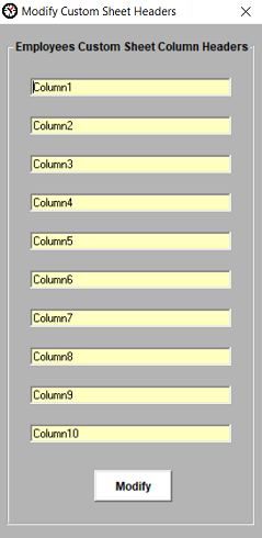 Employees Custom Information worksheet The Employees Custom Information worksheet is a dynamic feature created for managing employee information. This feature is available for any type of management input. You can manually enter any data into any column cell or you can use the Import Custom Sheet menu item feature to automatically import data from an Excel spreadsheet. When importing data, the column headers will be accounted for, so start your data in Excel on line 1. If there is any existing data when you import data from an Excel spreadsheet, the existing data will be overwritten by the data that is being imported. You can use the Export to Excel... feature to export the existing data first before importing any new data. To clear all of the data in the Employees Custom Information worksheet immediately, import a blank Excel worksheet. The Employee Custom Information worksheet offers the ability to rename specific column headers. This feature gives management the option of configuring the worksheet to their own reporting requirements based on the type of business and management's business model. Click on the Custom Sheet Headers menu item to modify the headers.