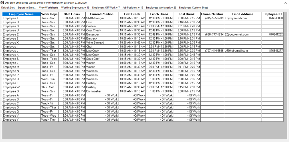 Employees Work Schedule Information worksheet The Employees Work Schedule Information worksheet provides important employee break details and work schedule information. Management can use this sheet to schedule work days and work hours for employees. In addition, employee data such as contact phone numbers, email addresses and employee ID's can be manually entered into the sheet. The data can be exported to an Excel spreadsheet at any time. The columns can be sorted. The column cells that can modified for each employee are: Work Days, Shift Hours, Phone Number, Email Address and Employee ID. Double click the desired cell to add, modify or delete the relevant data. All employees Shift Hours will be published in the Final Break Report when that report is manually or automatically generated.