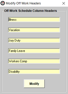 Employees Off Work Information worksheet The Employees Off Work Information worksheet keeps track of employees who are not working and why they are not working the workday shift. The worksheet displays the employee's name and their most recently assigned job position. The Work Days and Shift Hours columns data can be modified for each employee and any changes made will automatically update the Employees Work Schedule Information worksheet too. As you can see, you can add, modify and delete employee data in the Illness, Vacation, Jury Duty, Family Leave, Workers Comp and Disability column cells for each employee respectively. Example: You can add start/end dates, return dates or any desired data that will provide descriptive information of why employees are not working, how long they will be out of work and/or when they will return to work. The Employees Off Work Information worksheet offers the ability to rename specific column headers. This feature gives management the option of configuring the worksheet to their own reporting requirements based on the type of business and management's business model. Click on the Off Work Headers menu item to modify the headers.