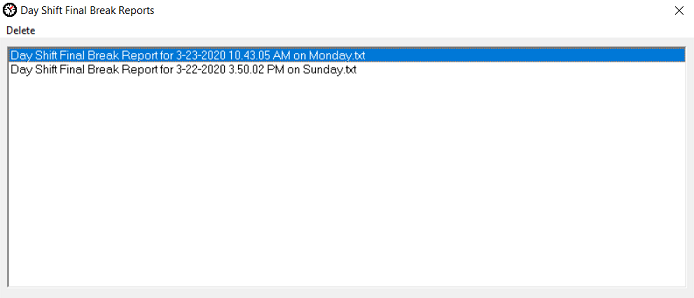 View Final Break Reports You can view, open (double click the desired entry) and delete existing shift scheduler Final Break Report's at any time by clicking on this reporting menu item. The Final Break Reports window will display a list of all Final Break Report that have been created/generated either manually or automatically. The most recent report created will display on the top line in the window. You can delete one or multiple reports simultaneously. Here is a picture of a typical Final Break Reports window.