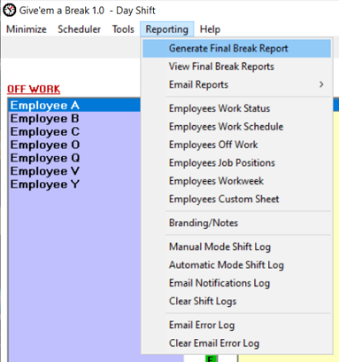 Give'em a Break's Final Break Report feature is entirely independent of shift scheduler usage and it can be generated at any time. Important: The Final Break Report is not automatically created/generated, saved or archived at any time during the workday shift. Use the End Time for Shift Scheduler feature (located in the Options.../Settings window) to automatically create and archive the shift scheduler's Final Break Report.