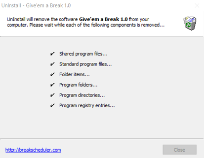 The Give'em a Break uninstall wizard will appear and display the uninstall progress as shown above.