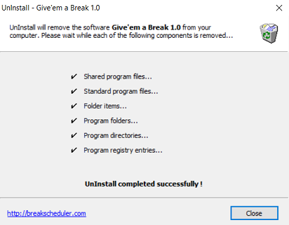 Give'em a Break's uninstall wizard will now display the final message that the uninstall completely successfully as shown above. Click the Close button to close the wizard. The Give'em a Break installation has now been removed from the computer.