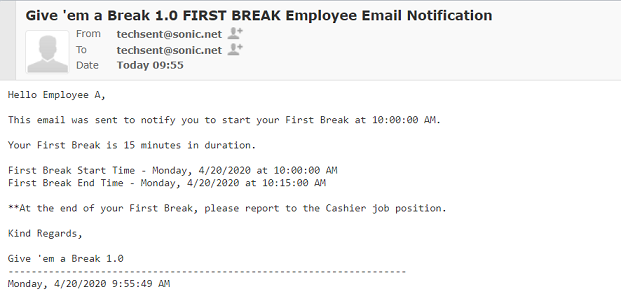 As you can see, the email sent to Employee A gives clear and concise break time direction and information. *Since this employee has been scheduled to fill the Cashier position after their Lunch Break completes, the email provides direction for them to do so. Automatic Tracking Mode = Give'em a Break will automatically send an email notification when any employee automatically starts their First, Lunch or Last Break. Manual Tracking Mode = An email notification will be automatically sent to the employee when you manually start the employee's First, Lunch or Last Break. -Send Emails to employees to start their relief breaks A relief break is a Relief Employee (Employee B) who is assigned to relieve a different employee (Employee A) and temporarily fill that employee's (Employee A) job position while Employee A is taking their scheduled break. Here is an example visual representation of an email that will be sent to Relief Employee B.