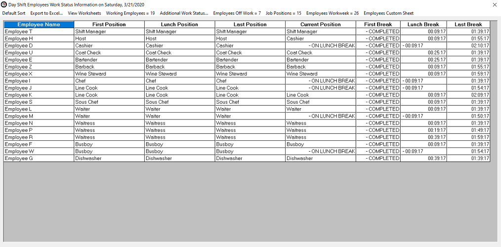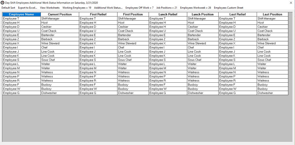 Employees Additional Work Status Information worksheet The Employees Additional Work Status Information worksheet will display the Employee Name, Current Position, First Relief, First Position, Lunch Relief, Lunch Position, Last Relief and the Last Position columns. The columns can be sorted. By sorting the desired columns, management can easily see and understand which employees are assigned to job positions and which employees are primarily Relief Employees, how many employees the Relief Employees provide relief breaks too and job position coverage after the First, Lunch, and Last Breaks complete. You can export the worksheet contents into an Excel spreadsheet. Worksheet cells cannot be modified in this worksheet. To view this worksheet, click on the Employees Work Status menu item on the Reporting menu and then click on the Additional Work Status... menu item. Here is a typical worksheet.