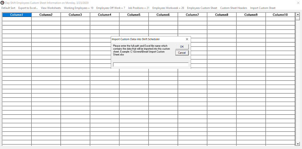 Employees Custom Information worksheet The Employees Custom Information worksheet is a dynamic feature created for managing employee information. This feature is available for any type of management input. You can manually enter any data into any column cell or you can use the Import Custom Sheet menu item feature to automatically import data from an Excel spreadsheet. When importing data, the column headers will be accounted for, so start your data in Excel on line 1. If there is any existing data when you import data from an Excel spreadsheet, the existing data will be overwritten by the data that is being imported. You can use the Export to Excel... feature to export the existing data first before importing any new data. To clear all of the data in the Employees Custom Information worksheet immediately, import a blank Excel worksheet. The Employee Custom Information worksheet offers the ability to rename specific column headers. This feature gives management the option of configuring the worksheet to their own reporting requirements based on the type of business and management's business model. Click on the Custom Sheet Headers menu item to modify the headers.