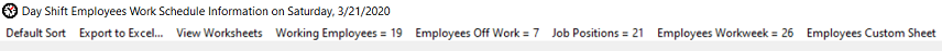 Employees Worksheets Menu Items Numerical Values Defined Many of the Employees shift scheduler worksheets display a numerical value next to their name. The definitions of those values are: Working Employees = 19 (This value is the amount of employees displayed in the Employees list located on the main dashboard interface). Employees Off Work = 7 (This value is the amount of employees displayed in the Off Work list located on the main dashboard interface). Job Positions = 21 (This value is the total amount of all unique job position names that have been added to the shift scheduler. This list is available by clicking on the Please Select... combo box drop down list that is located below the Current Position list on the main dashboard interface). Employees Workweek = 26 (This value is the total amount of employees included in the shift scheduler).