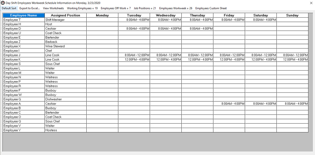 Employees Workweek Information worksheet The Employees Workweek Information worksheet is designed to schedule employees work schedule days based on the day of the week. In this example, the worksheet is being used to schedule employees workdays and hours per each calendar day. The columns can be sorted. You can also export the worksheet contents into a Excel spreadsheet. All calendar day columns can be modified. The Employee Name and Assigned Position columns cannot be modified.