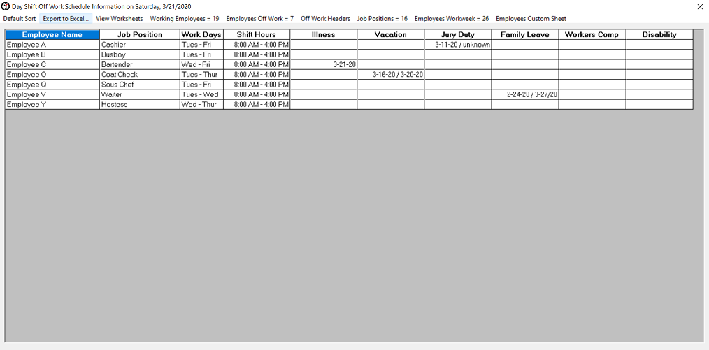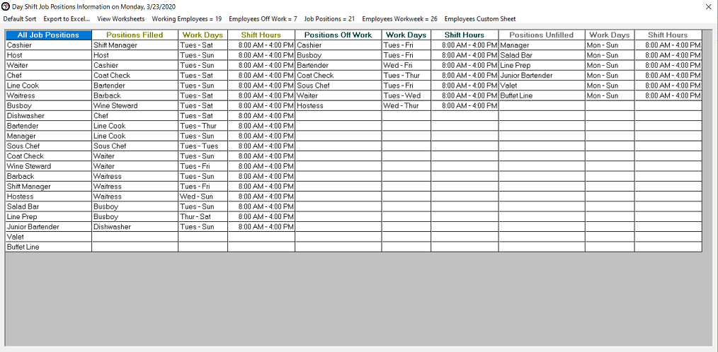 Employees Job Positions Information worksheet The Employees Job Positions Information worksheet keeps track of shift scheduler job positions throughout the workday shift. The four categories are: All Job Positions (this column includes every job position added to the shift scheduler). Positions Filled (this column includes the position type assigned to at least one employee and the count of a job position). Positions Off Work (this column displays the job positions assigned to employees that are not working and are listed in the Off Work list located on the main dashboard interface). Positions Unfilled (this column includes any job position that is not assigned to any employee in the Employees List. If a job position is assigned to only one employee and that employee starts their break, their job position will be temporarily added to this column which indicates that no employees are currently providing coverage at that position. Once the employee's break has completed, the job position will be removed from the column provided that the employee resumes working at that job position. If the employee works at a different job position after their break completes and no other employee is working that job position, the job position will remain in this column. This category also gives management the ability to modify the Work Days and Shift Hours data for those job positions. Double click on any of these cells to make changes). This worksheet feature will help to organize, keep track and plan for job position coverage to meet your business model goals.