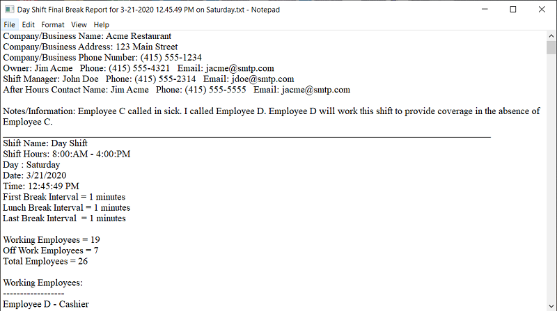 Give'em a Break's Reporting menu offers a comprehensive collection of various shift scheduler reports and logs. You can use these reporting tools for employee work scheduling, employee tracking and any type of employee data based on the needs of your company's business model. Additional real-time status reporting features provide a different perspective from the main dashboard interface which will assist operators to successfully manage employee breaks and job position coverage throughout the workday shift. Generate Final Break Report You can manually create/generate the shift scheduler Final Break Report at any time by clicking on this reporting menu item. The Final Break Report includes detailed information about the active workday shift. If Give'em a Break's Branding feature is used, detailed information about the company and management will be included in the report too. In addition, all employees in the shift scheduler (Employees list and the Off Work list) and their workday breaks will be included in the report. Here is a typical employee entry from a Final Break Report. ---------------------------FIRST BREAK
