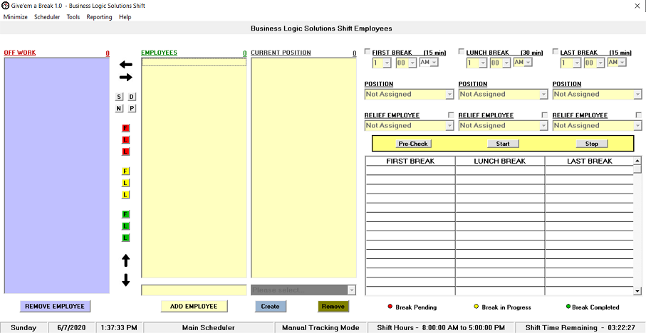 Give'em a Break's additional featured benefits include: § Scheduling of all employee breaks and whereabouts throughout the workday and workweek § Automatically or manually start, end and record employee breaks daily § Add/remove employees from the main dashboard scheduler as your business evolves § Easily create/remove employee job positions § Assign job positions to one or multiple employees simultaneously § Custom branding of the Final Break Report with your company's business name, address and management contacts § Designate employees to provide relief breaks to other employees during the work shift § Sort features to conveniently arrange employees by name, position, break status and next upcoming break § Manage and record coverage of a shift by moving employees to/from the off work list § Configure the main dashboard to easily keep track of employee whereabouts during training at various positions § Complete employee break management at different locations through one installation of Give'em a Break § Unlimited custom schedulers can be created for versatility of your business needs § Import Employee names and job positions from an excel spreadsheet § Dashboard message status bar will keep you informed of all employee break operations throughout a shift § Conveniently import a saved backup database file into a new or existing installation of Give'em a Break § Manually or automatically backup all shift schedulers to ensure maximum database protection and redundancy § Easily restore all shift schedulers to revert to a prior date and time § Job positions worksheet feature automatically keeps track of unfilled and filled job positions § Next Break Start Time feature displayed on the main dashboard interface § Work Schedule worksheet feature for scheduling of work days and work shift hours for all employees