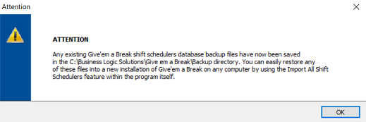 During the uninstall process, Give'em a Break will automatically create a directory named Backup in the root of the C:\ drive as shown above. All existing Give'em a Break shift schedulers database backup files will then be moved to the new Backup directory at the completion of the uninstall process. *You can utilize Give'em a Break's Import All Shift Schedulers feature located in the main dashboard interface at any time to import any of these saved database backup files into a new installation of Give'em a Break on the same computer or a different computer. This feature will conveniently restore an entire database of Give'em a Break shift schedulers based on the file name date/time stamp of when the backup was originally created. Click OK to close the message window above.
