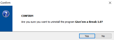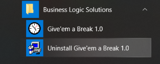 Give'em a Break 1.0 includes customized uninstaller files. These files will automatically execute in the background during the uninstall process to ensure the proper removal of the program from the computer. To uninstall Give'em a Break from the computer, navigate to the Windows Start button and move to the Business Logic Solutions folder and then click on the Uninstall Give'em a Break 1.0 shortcut. The uninstall confirmation will appear as shown below.