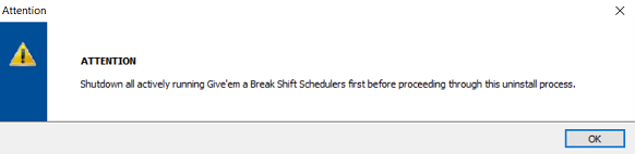 If applicable, shutdown all actively running Give'em a Break Shift Schedulers as prompted above and then click OK.